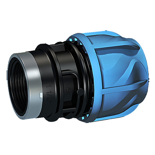 | iJoint kompressions overgangsmuffe til PE rør SDR17 og SDR11. Med konisk indvendigt rørgevind. Montage uden adskillelse. Materiale: Hus og omløber PP. Klemring POM. Tætning EPDM - velegnet til drikkevand. VA godkendt. PN 16. ÷10-+45°C. | |