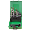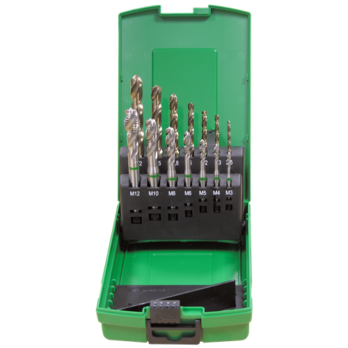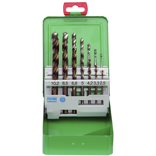 | Sæt med 7 spiraltappe 35° HSSE M3, M4, M5, M6, M8, M10, M12 mm samt tilhørende gevindbor HSS Co5 Ø2,5 / 3,2 / 4,2 / 5,0 / 6,8 / 8,5 / 10,2 mm i plastkassette. Maskinsnittappe af koboltlegeret højpræstations-hurtigstål. På grund af den større varmehårdheds bestandighed opnås en længere standtid. Til gennemgangsgevind og bundhulsgevind i ulegeret og legeret stål op til 1000 N/mm² styrke. Gevindet bliver skåret i en arbejdsgang. | |