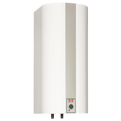 98 ltr. 1/3 kW, 230/400 volt. METRO THERM el-vandvarmer model 110 leverer varmt brugsvand til køkken, håndvask og brusebade i enfamilieshuse og andre mindre installationer. Brugsvandet opvarmes af et keramisk el-varmelegeme, der er monteret i et emaljeret flangerør. Det giver mindre kalk på varmelegemet, og beholderen er ikke så udsat for gennemtæring. Temperaturen styres trinløst af en indbygget termostat fra ca. 5- 65°C. Trykfast konstruktion - 10 bar til lodret montering på væg eller gulvstativ med rørforbindelserne ned ad. Vandvarmeren leveres som standard med et universal varmelegeme på 3 kW/400 volt, og kan uden ændringer tilsluttes 230 volt. Effekten bliver da 1 kW. Sikkerhedsaggregat medfølger som standard.