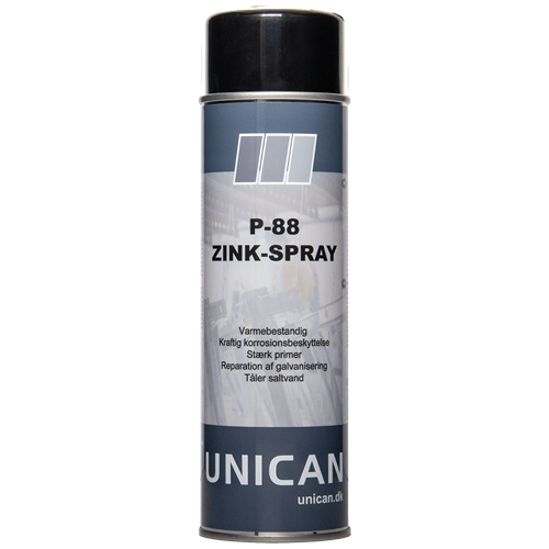 | P-88 Zink-Spray er et produkt, som kan sammenlignes med varmeforzinkning. Produktet bruges til overfladebehandling af stål, svejse-fuger, ridser mv. P-88 Zink Spray kan også anvendes som en særdeles effektiv korrosionsbeskytter eller som en kraftig grunder. Produktet indeholder over 93% rent zink i tør-filmen. Produktet er støvtørt efter 15-30 min og er i løbet af kort tid overmalbar. Ophærdet efter kun 12 timer. P-88 Zink Spray er varmebestandig helt op til 500°C og hæfter også på rustne overflader. Dog anbefales det, at man inden brug sikrer sig, at overfladen er ren og tør, derved opnås det bedste resultat. Fjern evt. fedt, voks og andet snavs med C-1000 Power Cleaner. Påfør P-88 Zink spray udendørs eller i lokaler med tilstrækkelige udluftningsmuligheder. Produktet bør for bedste resultat påføres i en temperatur på mellem 15°C-25°C og en luftfugtighed på ikke under 60%. Ryst dåsen omhyggeligt. Gentag evt. påføringen 2-3 gange for optimal beskyttelse. Efter endt brug vendes dåsen på hovedet og der sprayes i nogle få sekunder, derved rengøres dysen og man undgår tilstopning. | |